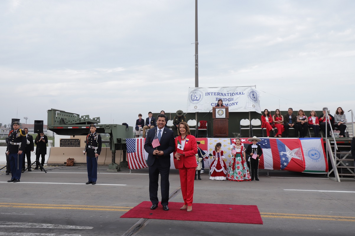 Nuevo Laredo, Tam./Laredo, Texas.- El Gobernador, Francisco García Cabeza de Vaca y la Presidenta del Congreso de los Estados Unidos, Nancy Pelosi, presidieron este sábado la ceremonia del abrazo a mitad del puente de esta frontera, con motivo de la Conmemoración del Natalicio de George Washington, celebración con 122 años de historia.